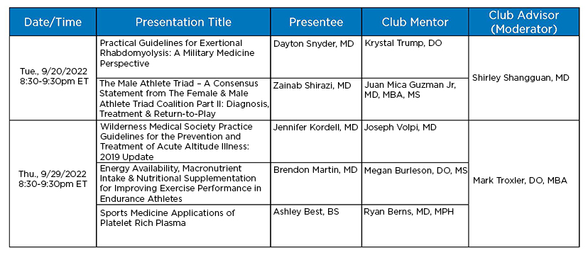 CLUB ADVISORS – A core group serving as Faculty Advisors that would participate in one Journal Club Meeting and would mentor up to max: three Presentees (Student and Resident members) scheduled to give their presentation during a specific AMSSM Journal Club Meeting (max: 1 hour) and would be available for questions prior to the presentations and attend the Journal Club Meeting to observe their three