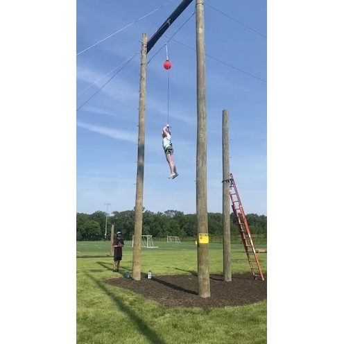 Testing a new high-ropes course for her work a week ago, a 23-year-old recreation department employee leapt from an elevated platform toward a grab-bar. She missed the bar and after falling about 6 feet, the safety harness rope became stuck under her helmet, causing the helmet chin strap to strangulate her. Coworkers recalled her arms flapping outstretched to her side with likely brief loss of consciousness; recorded video of the event support this. Case Photo #10 .