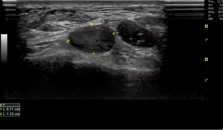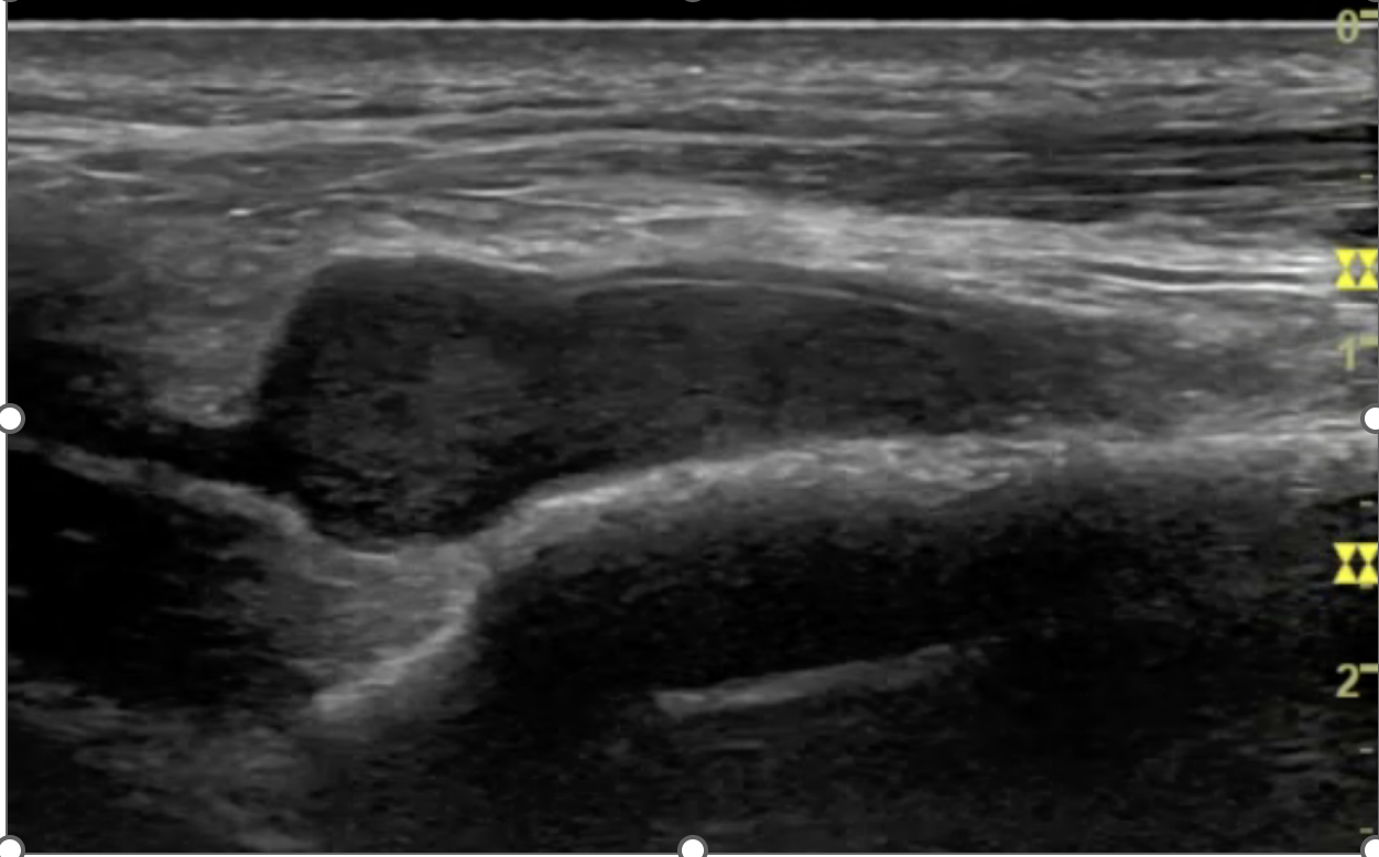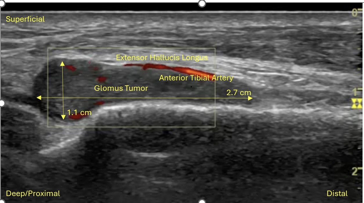 Teaching Pearl: Glomus tumors typically present in the upper extremities (particularly the hand/fingers) and as such can often be difficult to diagnose in other parts of the body. Patients with glomus tumors often have pinpoint tenderness, paroxysmal pain, and cold sensitivity. Clinical diagnosis can be tricky as those three characteristics are often isolated and less frequently occur together. US/MRI are the diagnostic imaging modalities of choice. US with doppler can be helpful in diagnosis as they can be mistaken for other benign masses and can help assist in the evaluation of an arterial supply feeding the tumor. A case series from the Hospital for Special Surgery (HSS) over the course of 18 years excised 11 glomus tumors from the foot, with the majority of them located in the distal hallux.1 The glomus tumor from this case matches descriptions of other extradigital glomus tumors, including a "vascular stack", however it is larger in size compared to the mean size (1 cm) from a study analyzing non-subungal glomus tumors.2 Typical glomus tumors are visualized as small, well-circumscribed, hypoechoic nodule with prominent arterial flow (vascular stalk).