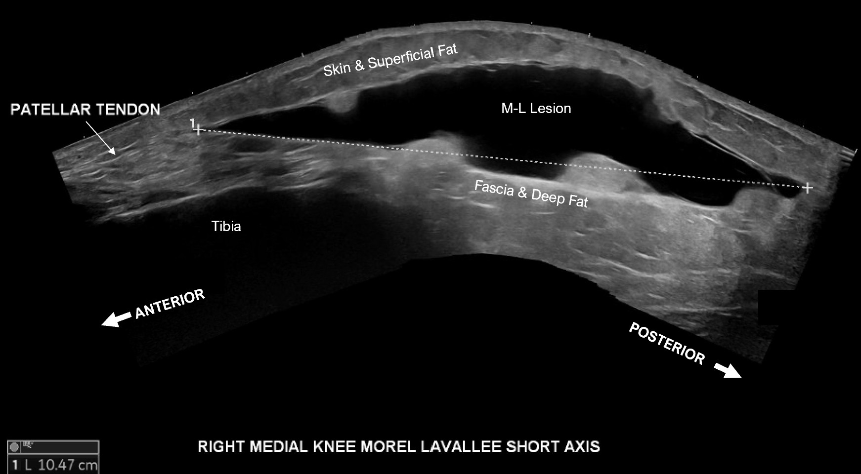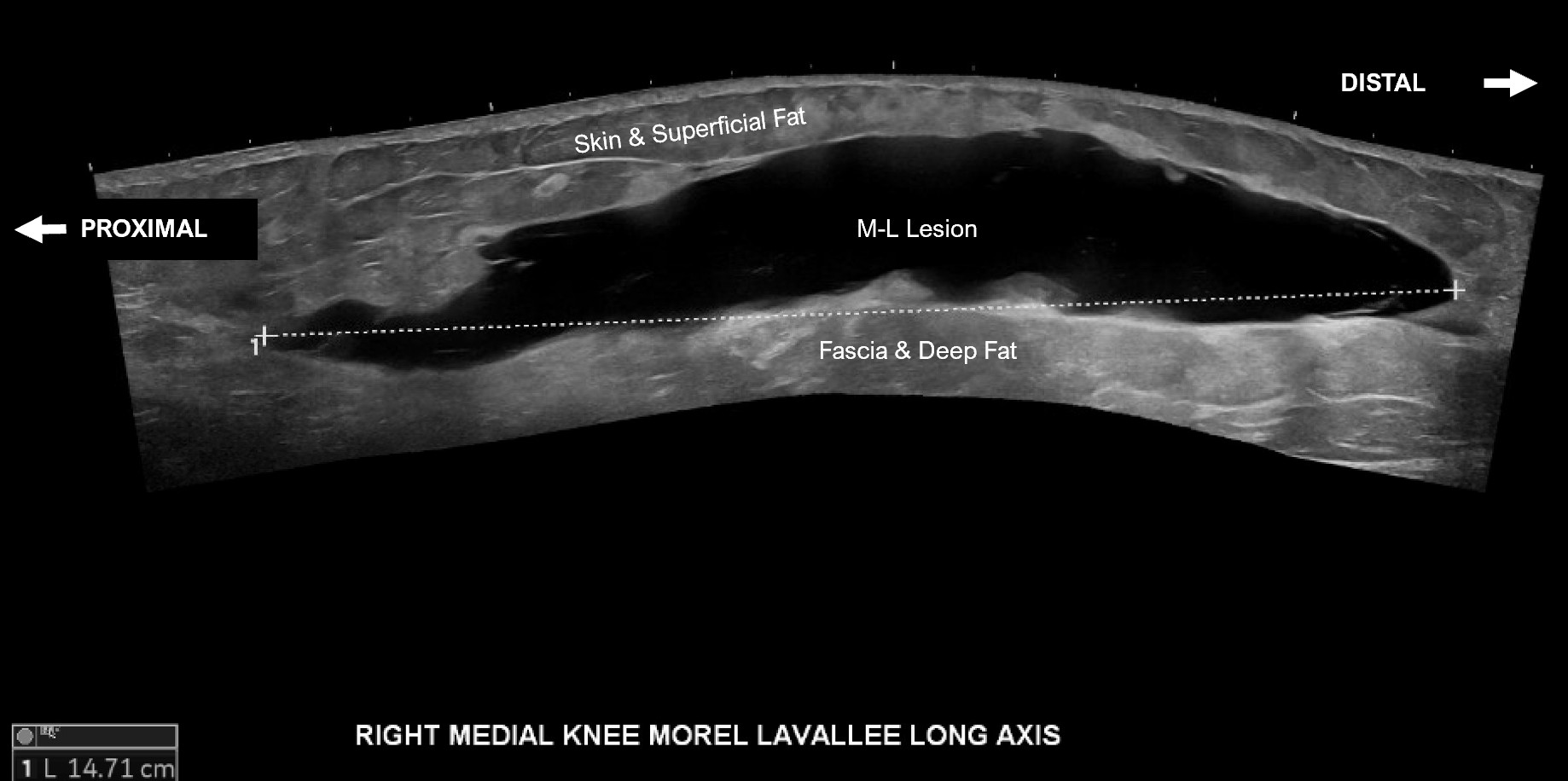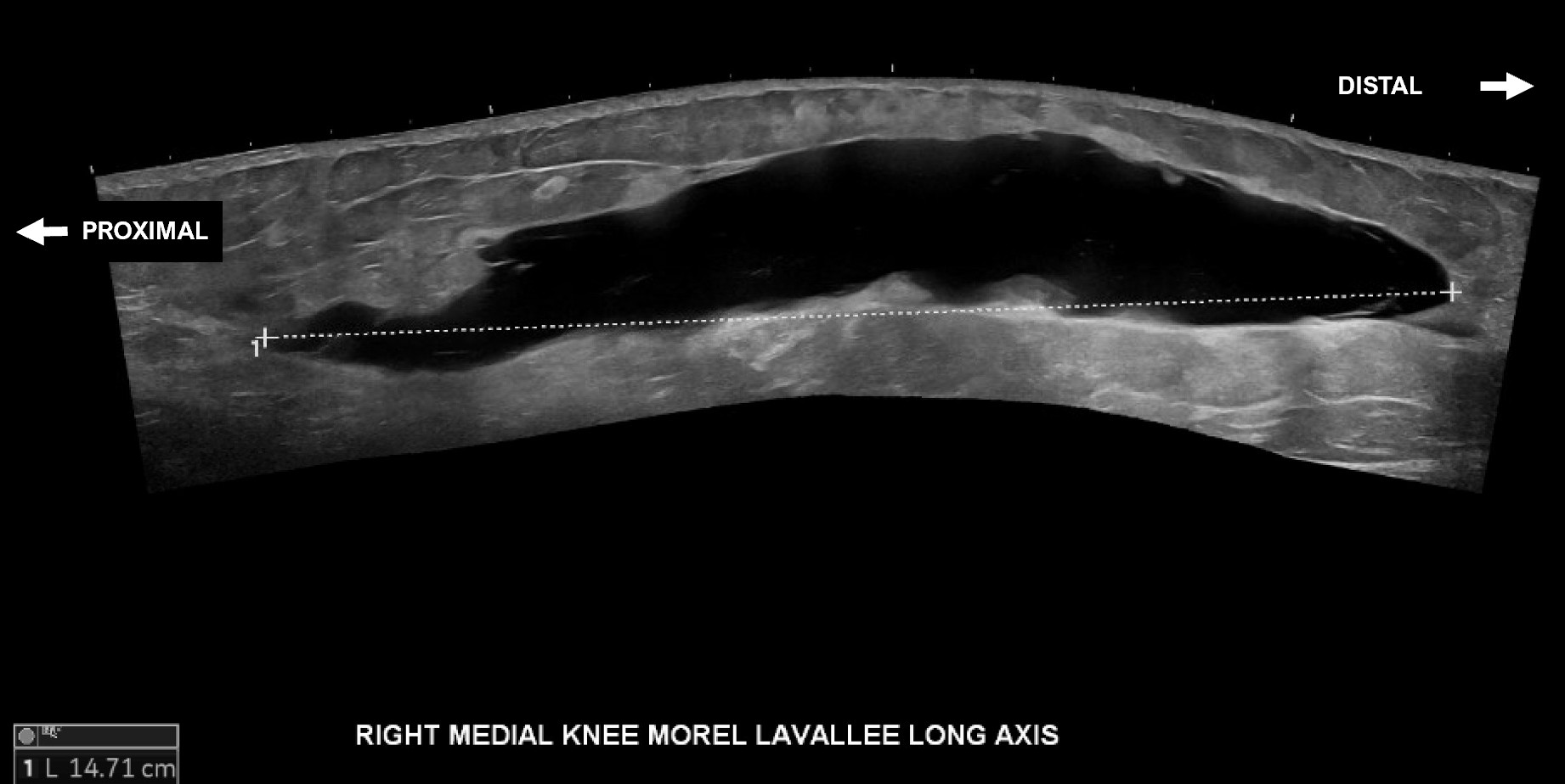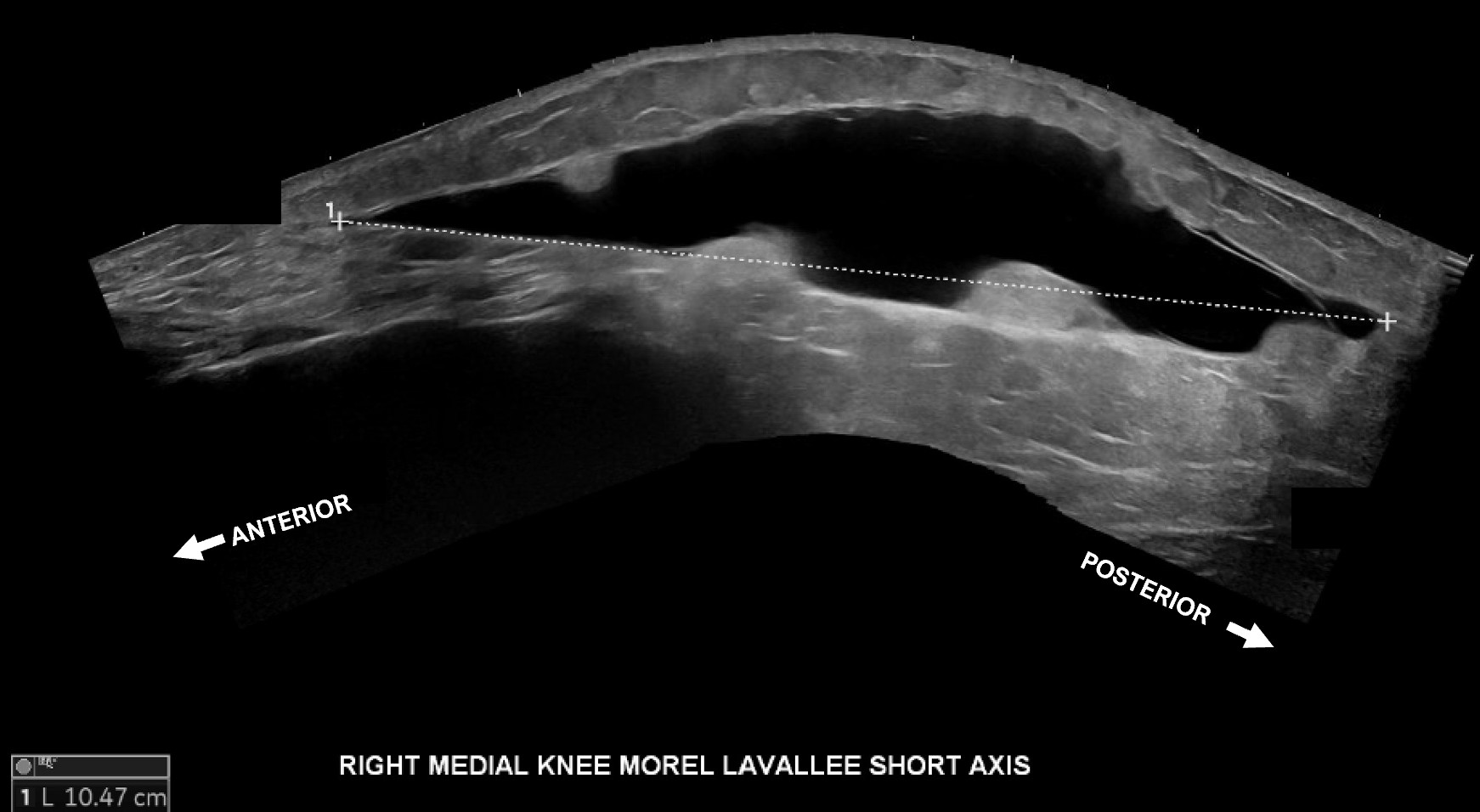 Clinical Vignette: A 31-year-old female rugby player presented with 17 days of right knee pain following a direct blow to the medial knee while being tackled. She endorsed medial knee pain with associated swelling, as well as numbness and tingling localized to the injury location. She denied prior history of right knee injury. She had a history of left knee complete ACL rupture ten years ago status-post surgical reconstruction. She also had a Morel-Lavallee lesion near her left knee five years ago from a rugby injury that resolved with conservative management. Exam was notable for significant ecchymosis over the medial knee with a large area of fluctuance consistent with a possible fluid pocket, with no warmth or erythema present. She was tender to palpation over the right medial femoral condyle and medial patellar facet. She had no strength or range of motion deficits, no ligamentous laxity, and normal special tests. 170 mL of serous fluid was aspirated with ultrasound-guidance, followed by a corticosteroid injection. The lesion recurred three months after ther initial aspiration (about four months post-injury) and was re-aspirated yielding only 10 mL of serous fluid, followed by another corticosteroid injection. She attempted return-to-sport four months after the second aspiration (about eight months after injury), but the lesion recurred a subsequent time. This time following aspiration of 37 mL of serous fluid, a doxycycline sclerodesis was performed. Unfortunately, the lesion recurred two months later after the sclerodesis, and she ultimately underwent an open surgical resection of the lesion with short-term drain placement about one full year after the initial injury. Her post-operative course was uncomplicated, and she returned to rugby four months after surgery without recurrence of the Morel-Lavallee lesion. Given her history of bilateral Morel-Lavallee lesions, she is undergoing a workup for connective tissue disorders.