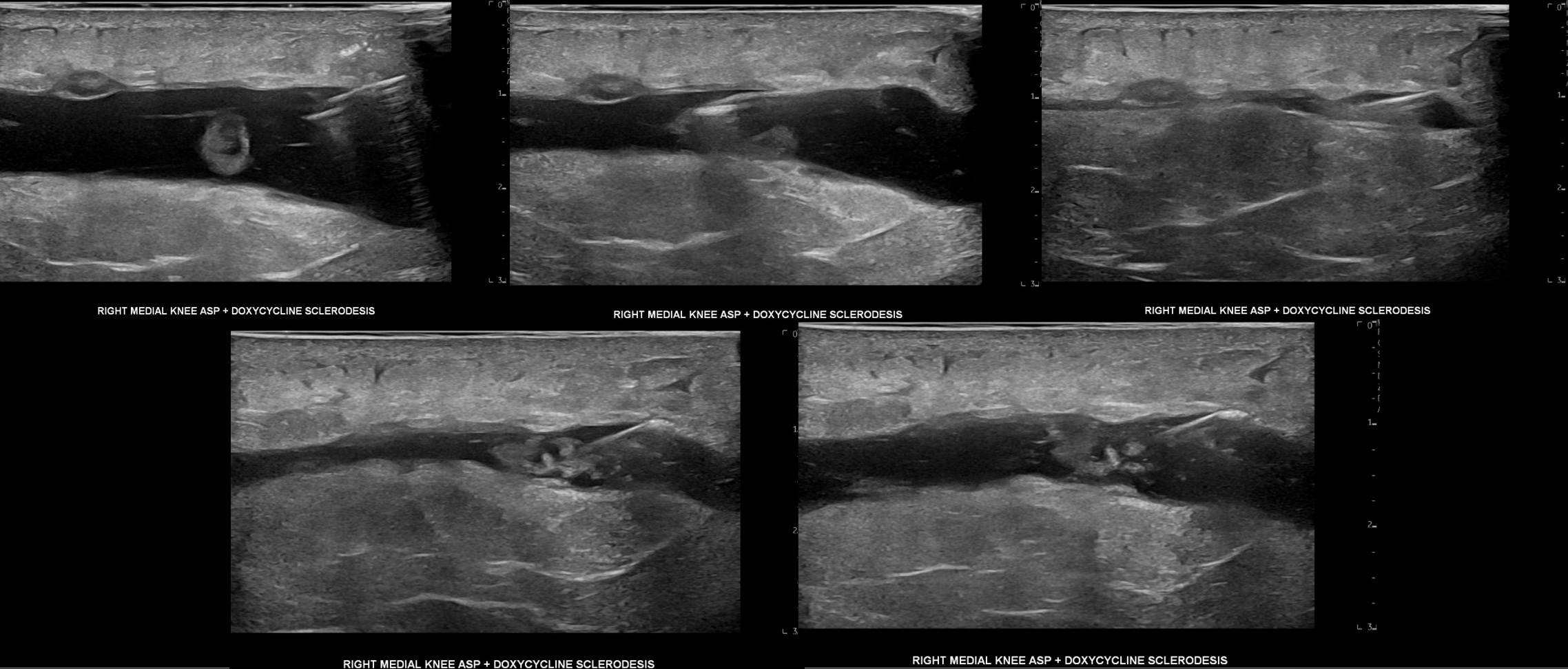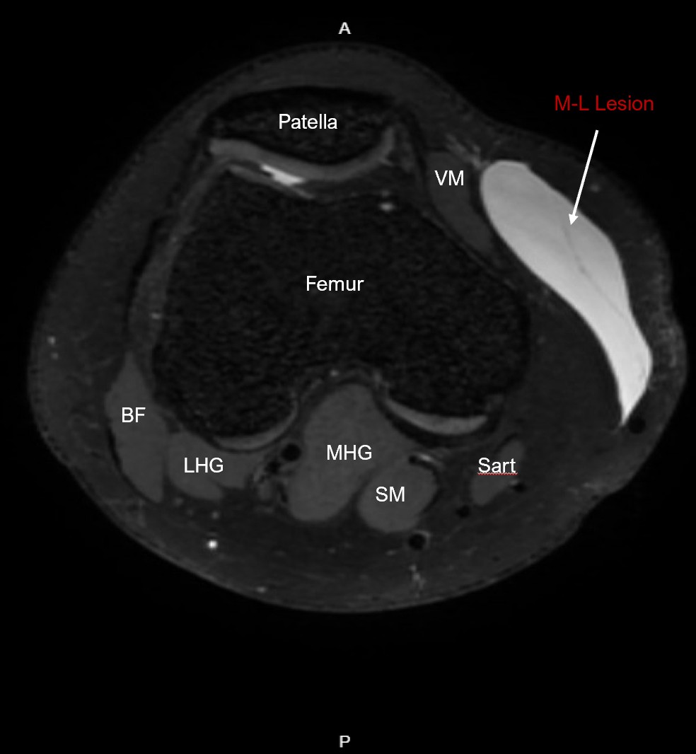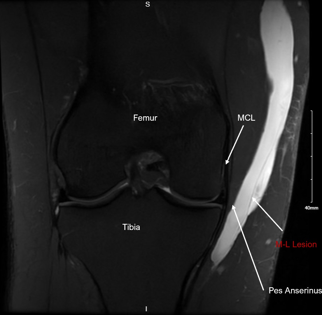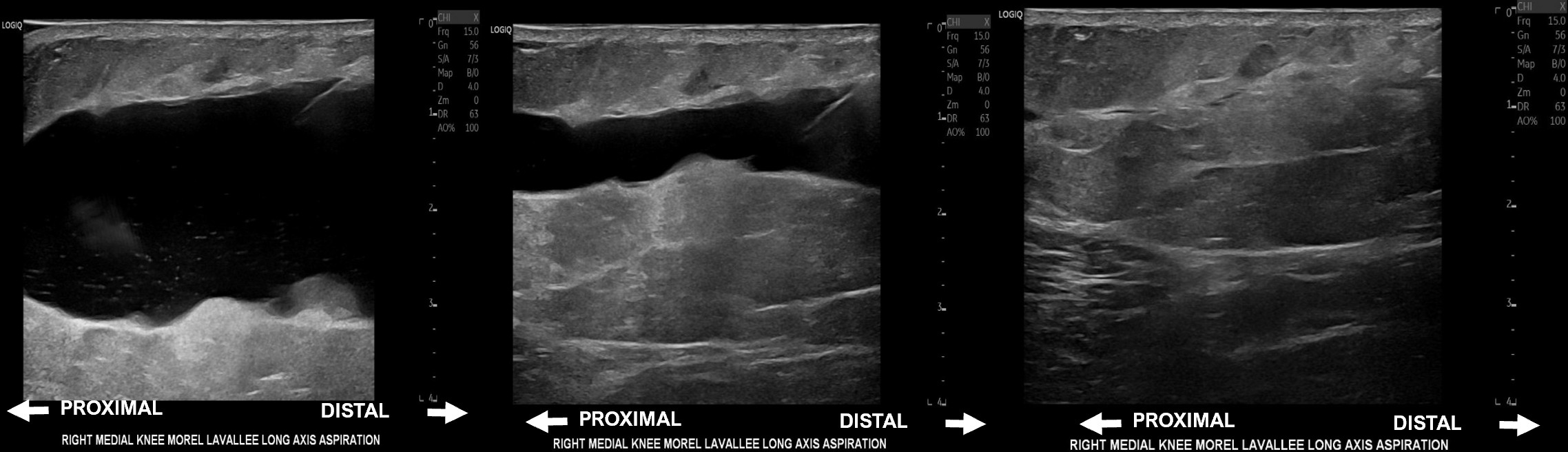 Clinical Vignette: A 31-year-old female rugby player presented with 17 days of right knee pain following a direct blow to the medial knee while being tackled. She endorsed medial knee pain with associated swelling, as well as numbness and tingling localized to the injury location. She denied prior history of right knee injury. She had a history of left knee complete ACL rupture ten years ago status-post surgical reconstruction. She also had a Morel-Lavallee lesion near her left knee five years ago from a rugby injury that resolved with conservative management. Exam was notable for significant ecchymosis over the medial knee with a large area of fluctuance consistent with a possible fluid pocket, with no warmth or erythema present. She was tender to palpation over the right medial femoral condyle and medial patellar facet. She had no strength or range of motion deficits, no ligamentous laxity, and normal special tests. 170 mL of serous fluid was aspirated with ultrasound-guidance, followed by a corticosteroid injection. The lesion recurred three months after ther initial aspiration (about four months post-injury) and was re-aspirated yielding only 10 mL of serous fluid, followed by another corticosteroid injection. She attempted return-to-sport four months after the second aspiration (about eight months after injury), but the lesion recurred a subsequent time. This time following aspiration of 37 mL of serous fluid, a doxycycline sclerodesis was performed. Unfortunately, the lesion recurred two months later after the sclerodesis, and she ultimately underwent an open surgical resection of the lesion with short-term drain placement about one full year after the initial injury. Her post-operative course was uncomplicated, and she returned to rugby four months after surgery without recurrence of the Morel-Lavallee lesion. Given her history of bilateral Morel-Lavallee lesions, she is undergoing a workup for connective tissue disorders.