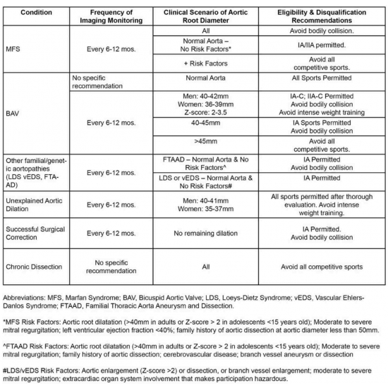 10.Braverman AC, Harris KM, Kovacs RJ, Maron BJ; American Heart Association Electrocardiography and Arrhythmias Committee of Council on Clinical Cardiology, Council on Cardiovascular Disease in Young, Council on Cardiovascular and Stroke Nursing, Council on Functional Genomics and Translational Biology, and American College of Cardiology. Eligibility and Disqualification Recommendations for Competitive Athletes With Cardiovascular Abnormalities: Task Force 7: Aortic Diseases, Including Marfan Syndrome: A Scientific Statement From the American Heart Association and American College of Cardiology. Circulation. 2015 Dec 1;132(22):e303-9. doi: 10.1161/CIR.0000000000000243. Epub 2015 Nov 2. PMID: 26621648.