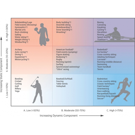 12.Levine BD, Baggish AL, Kovacs RJ, Link MS, Maron MS, Mitchell JH; American Heart Association Electrocardiography and Arrhythmias Committee of Council on Clinical Cardiology, Council on Cardiovascular Disease in Young, Council on Cardiovascular and Stroke Nursing, Council on Functional Genomics and Translational Biology, and American College of Cardiology. Eligibility and Disqualification Recommendations for Competitive Athletes With Cardiovascular Abnormalities: Task Force 1: Classification of Sports: Dynamic, Static, and Impact: A Scientific Statement From the American Heart Association and American College of Cardiology. Circulation. 2015 Dec 1;132(22):e262-6. doi: 10.1161/CIR.0000000000000237. Epub 2015 Nov 2. PMID: 26621643.
