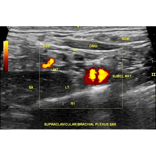 Ultrasound image showing long axis parallel to rib 1, transverse to brachial plexus trunks. Case Photo #4 . Shows normal omohyoid, subclavius muscle, 1st rib, subclavian artery, but large serratus anterior muscle. Prior clavicle fracture site seen with slight cortical irregularity and pain to sono-palpation. Scarring between lower/inferior trunk (LT) and rib 1 (R1) and middle trunk (MT) and upper/superior trunk (UT). Scarring is also noted between R1 and LT and enlargement at MT and UT.